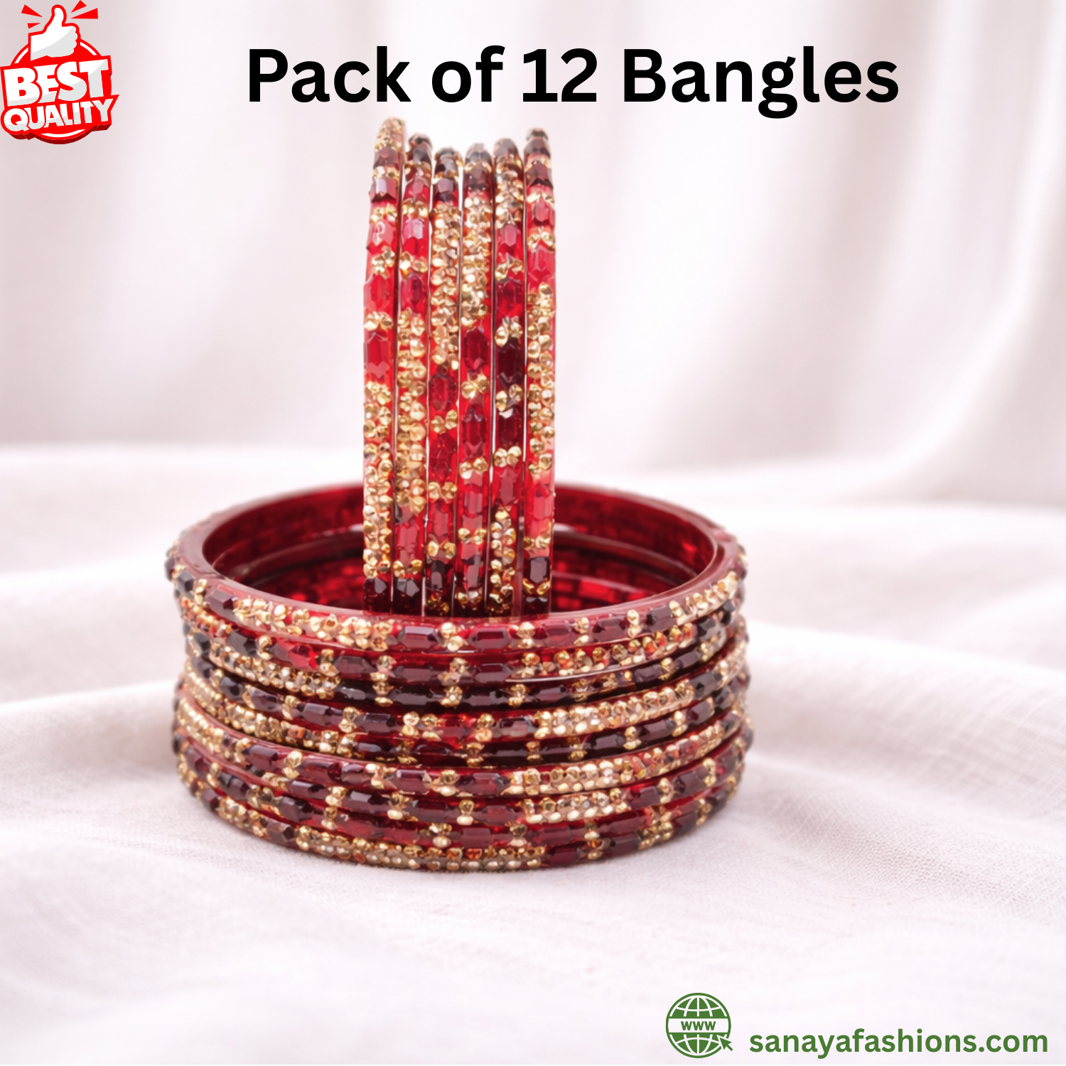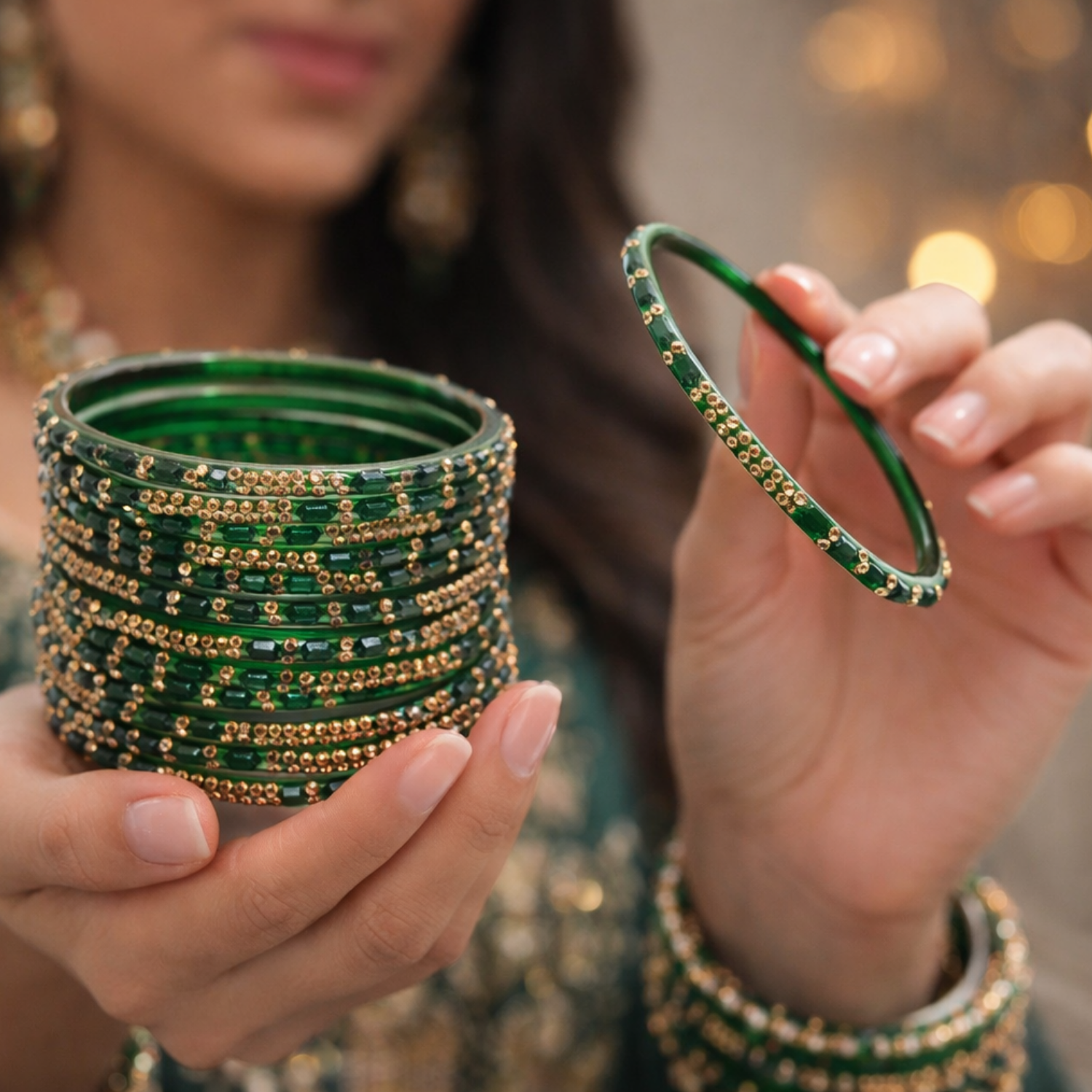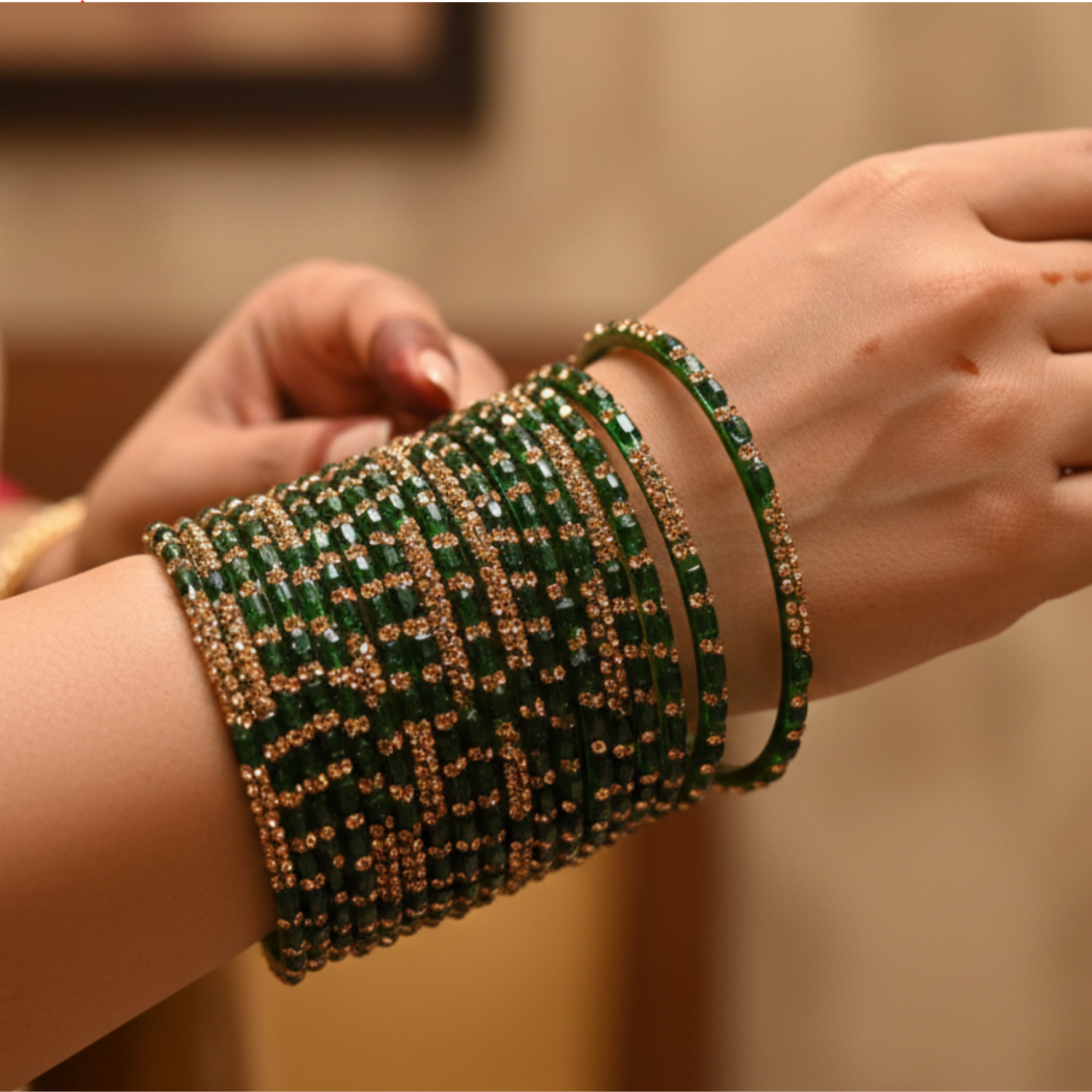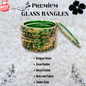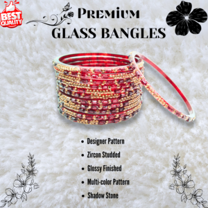 Made from high-quality glass, these bangles offer a smooth finish, rich color depth, and long-lasting shine. Each bangle is carefully adorned with sparkling stone work and golden detailing, giving it a luxurious appearance that beautifully reflects Indian craftsmanship. The intricate design makes these bangles a perfect statement accessory for weddings, festivals, and special occasions.