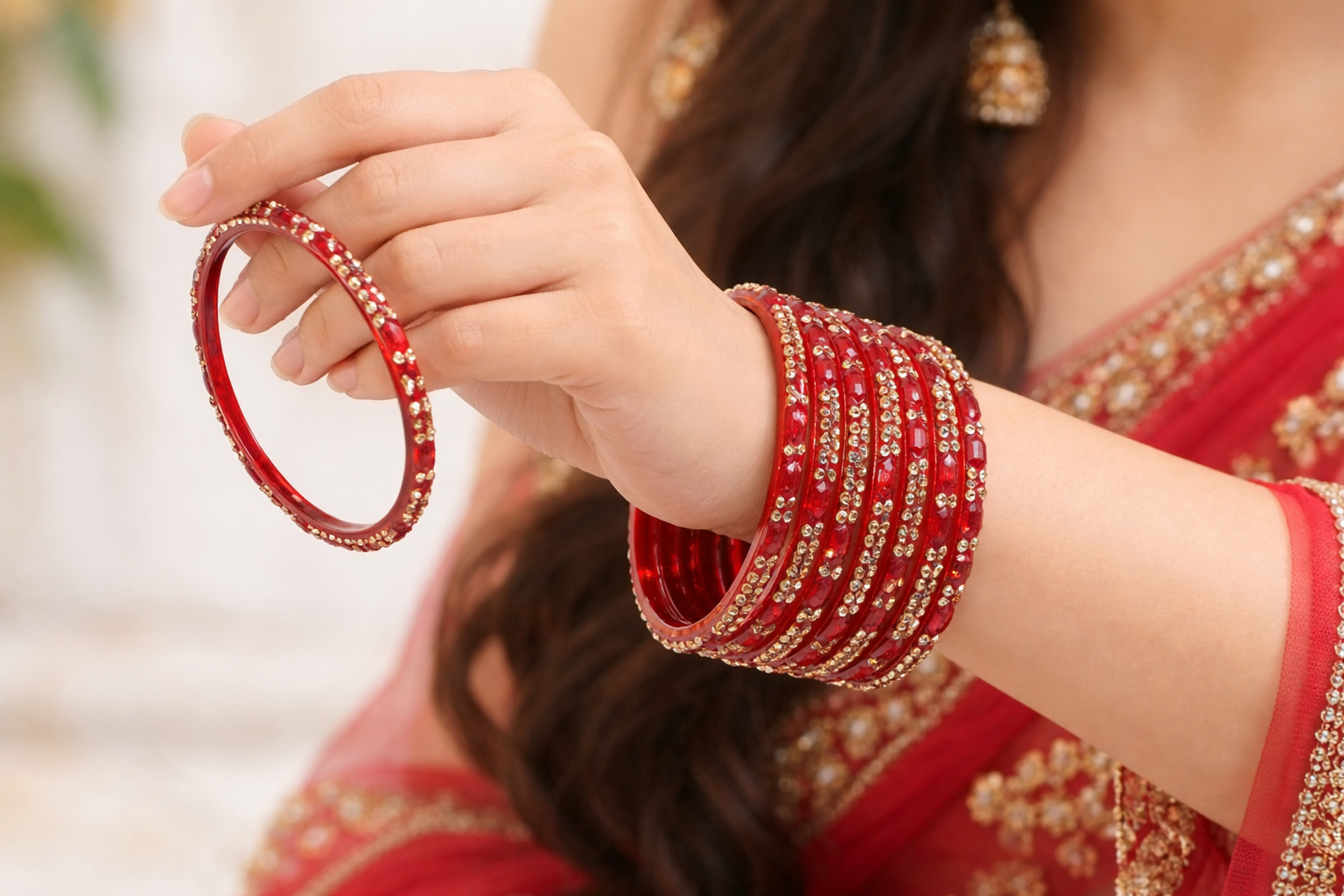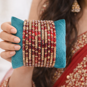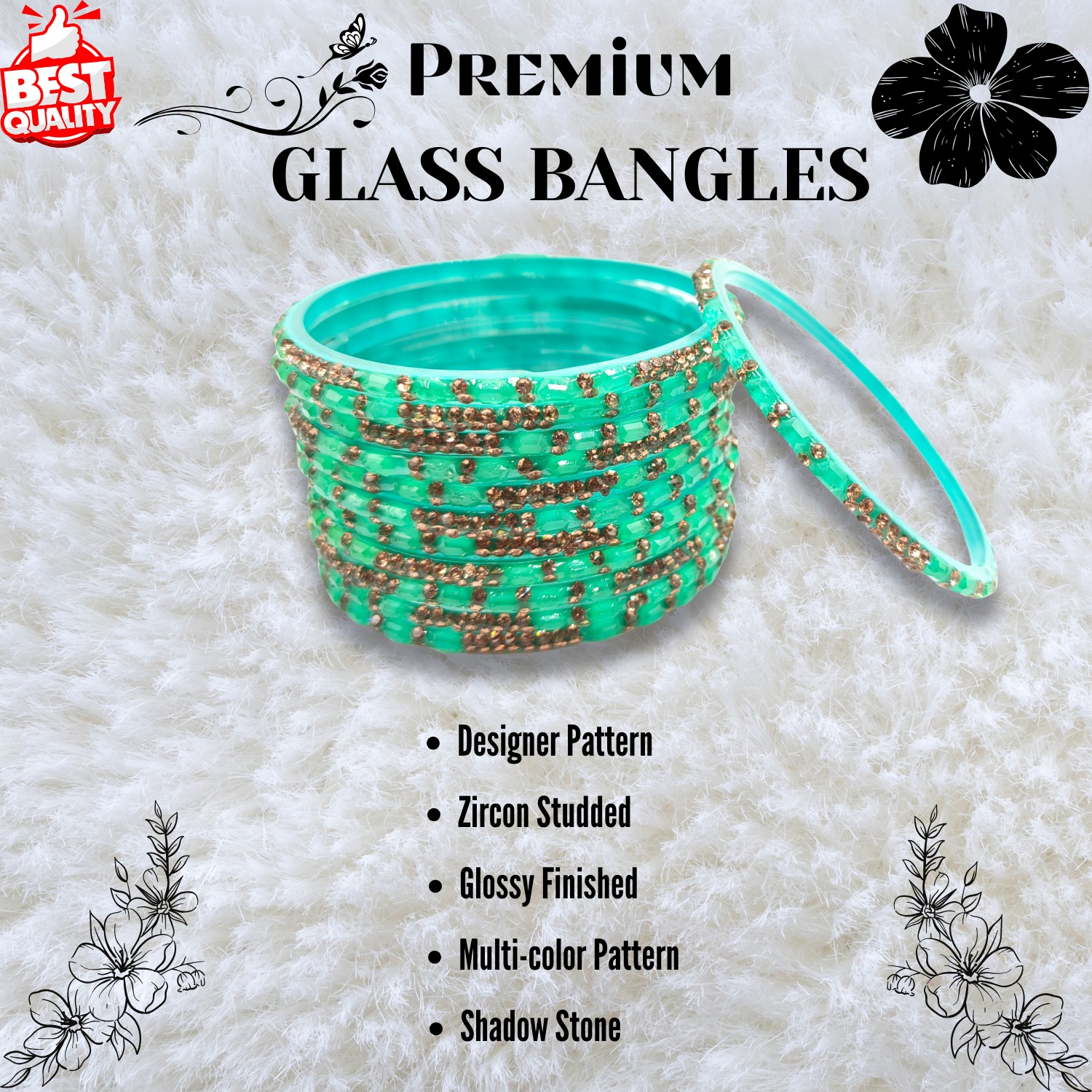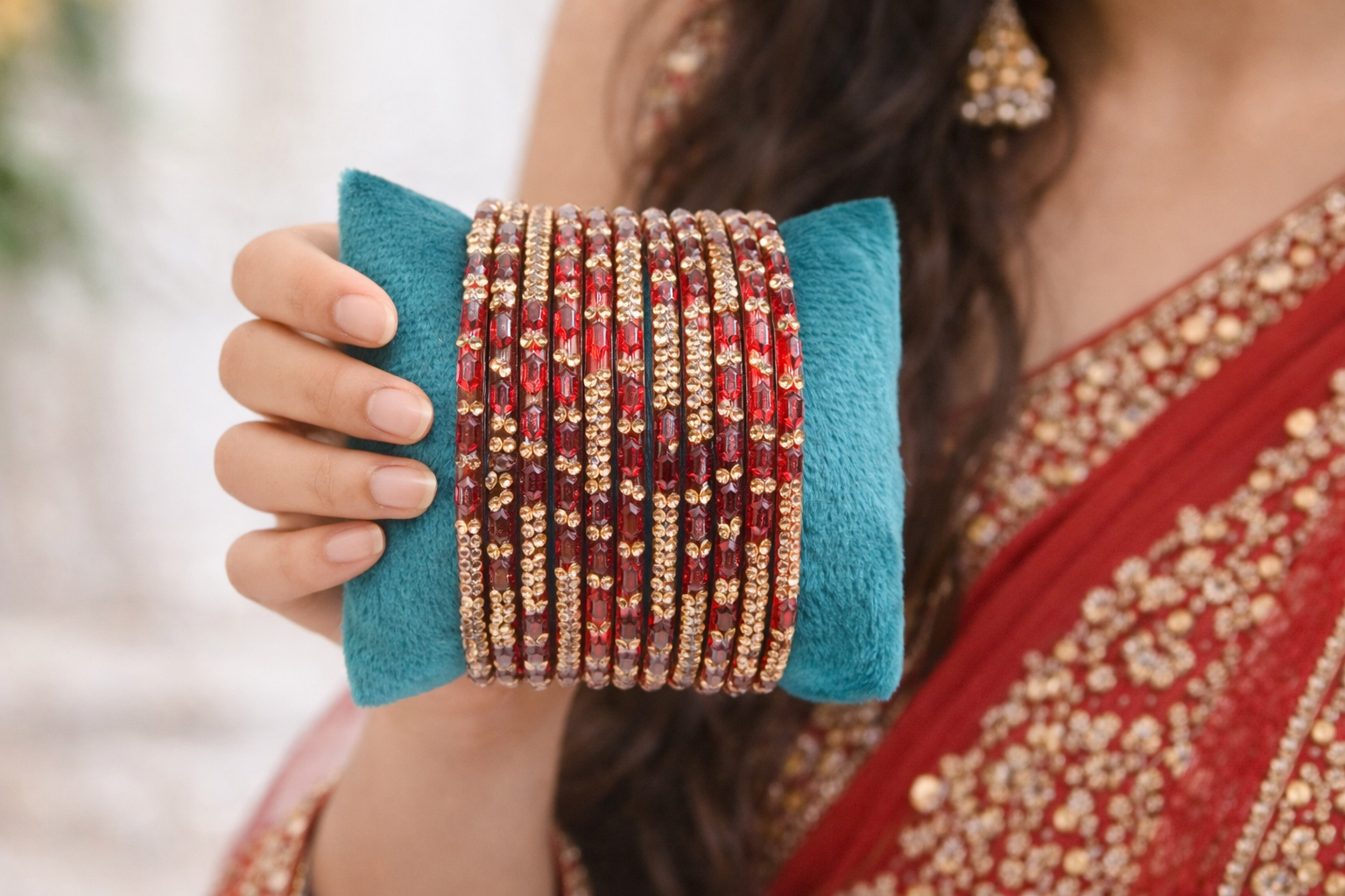 Made from high-quality glass, these bangles offer a smooth finish, rich color depth, and long-lasting shine. Each bangle is carefully adorned with sparkling stone work and golden detailing, giving it a luxurious appearance that beautifully reflects Indian craftsmanship. The intricate design makes these bangles a perfect statement accessory for weddings, festivals, and special occasions.
