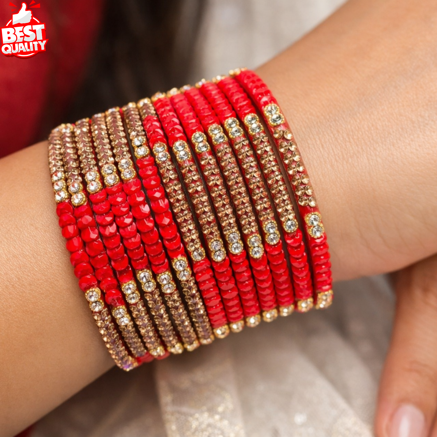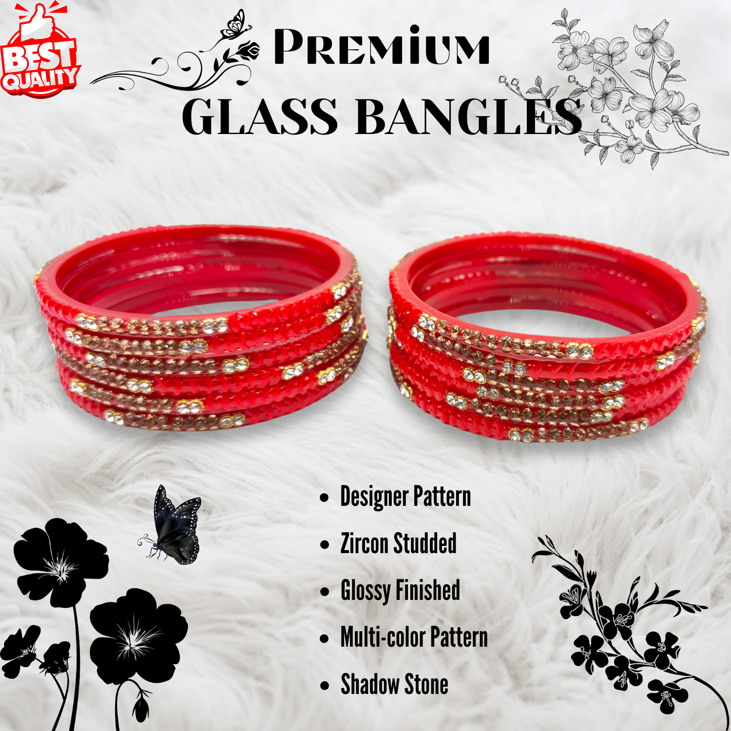 Made from high-quality glass, these bangles offer a smooth finish, rich color depth, and long-lasting shine. Each bangle is carefully adorned with sparkling stone work and golden detailing, giving it a luxurious appearance that beautifully reflects Indian craftsmanship. The intricate design makes these bangles a perfect statement accessory for weddings, festivals, and special occasions.