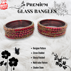 Made from high-quality glass, these bangles offer a smooth finish, rich color depth, and long-lasting shine. Each bangle is carefully adorned with sparkling stone work and golden detailing, giving it a luxurious appearance that beautifully reflects Indian craftsmanship. The intricate design makes these bangles a perfect statement accessory for weddings, festivals, and special occasions.