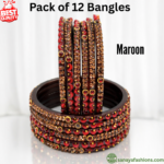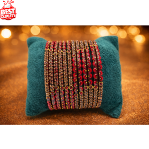 Made from high-quality glass, these bangles offer a smooth finish, rich color depth, and long-lasting shine. Each bangle is carefully adorned with sparkling stone work and golden detailing, giving it a luxurious appearance that beautifully reflects Indian craftsmanship. The intricate design makes these bangles a perfect statement accessory for weddings, festivals, and special occasions.