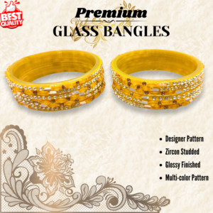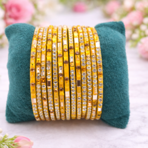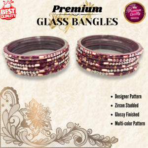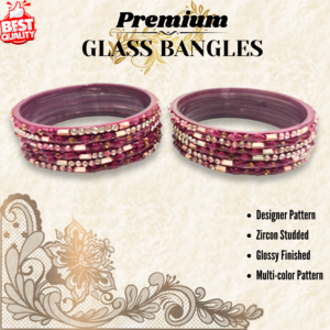 Made from high-quality glass, these bangles offer a smooth finish, rich color depth, and long-lasting shine. Each bangle is carefully adorned with sparkling stone work and golden detailing, giving it a luxurious appearance that beautifully reflects Indian craftsmanship. The intricate design makes these bangles a perfect statement accessory for weddings, festivals, and special occasions.