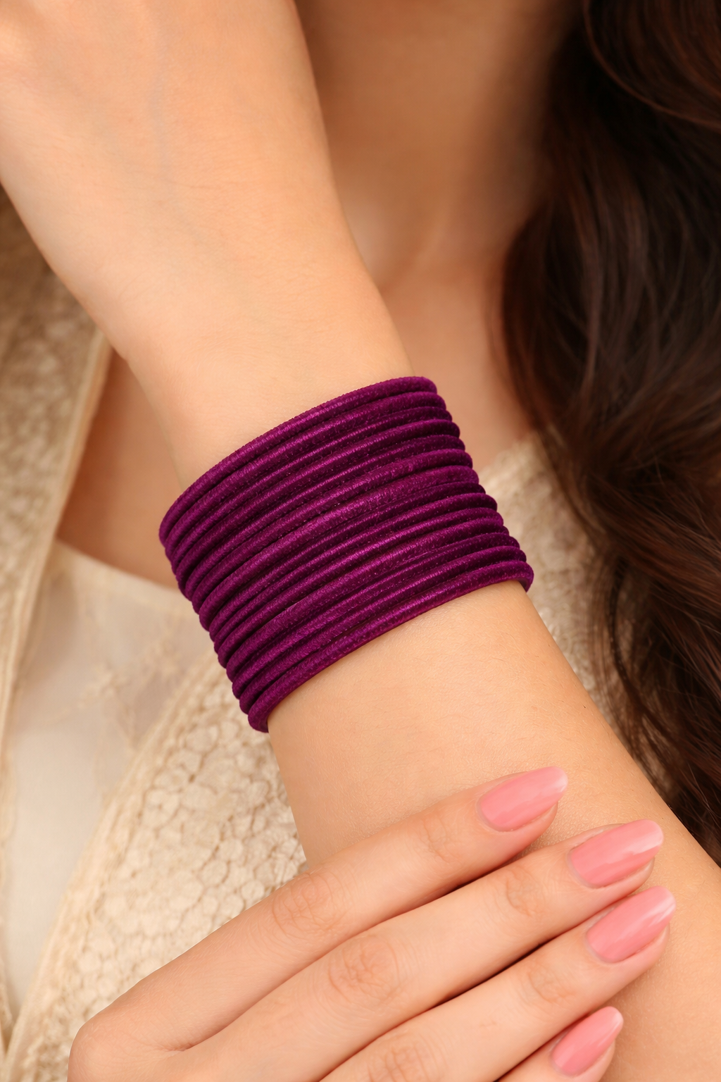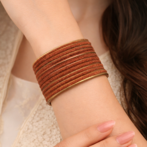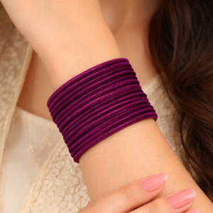 Made from high-quality glass and wrapped in a smooth velvet finish, these bangles offer a rich, luxurious look while ensuring comfort on the wrist. The soft velvet coating not only enhances the visual appeal but also provides a gentle feel, preventing irritation and making them comfortable to wear for long hours. The deep, vibrant color adds richness and pairs beautifully with both ethnic and contemporary attire.