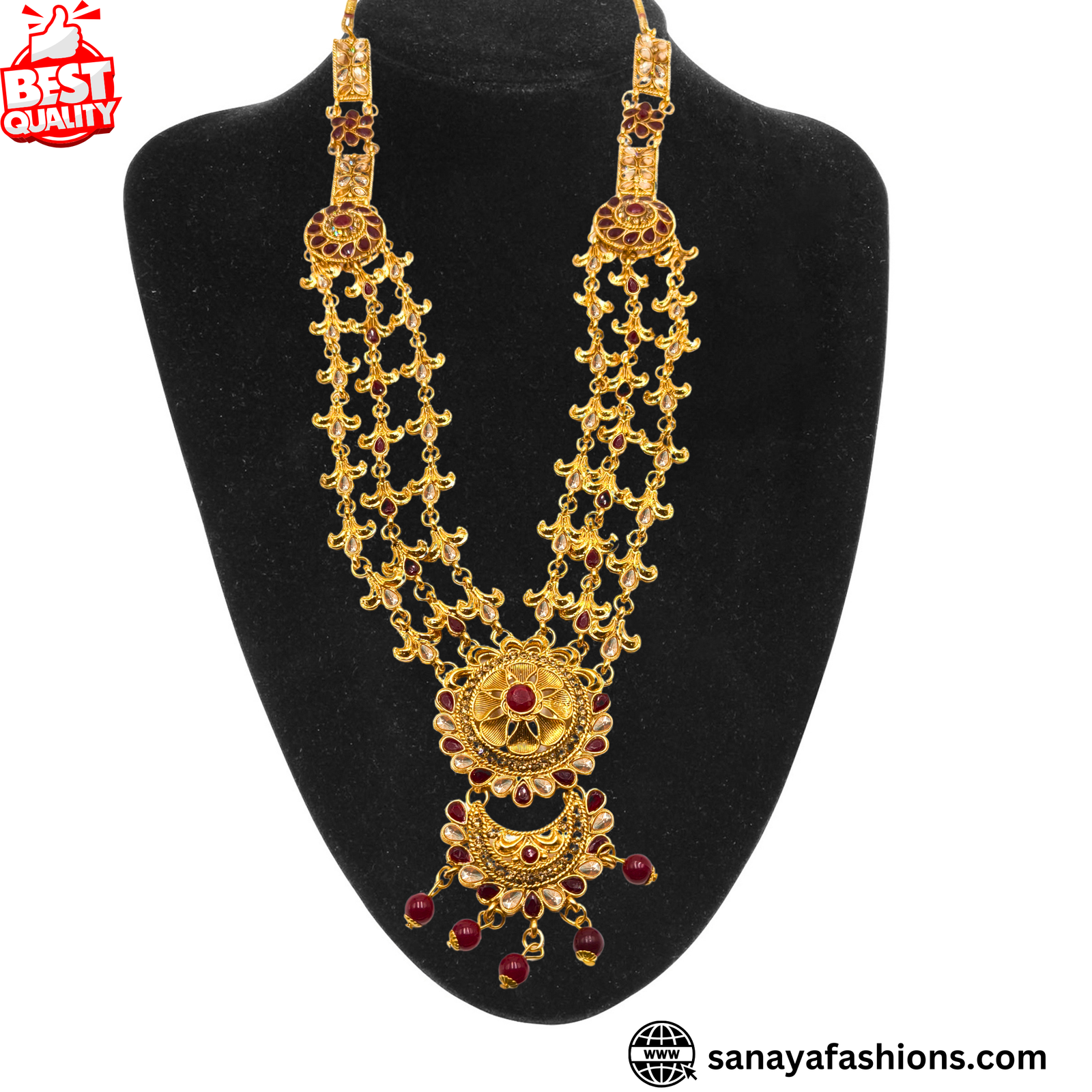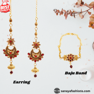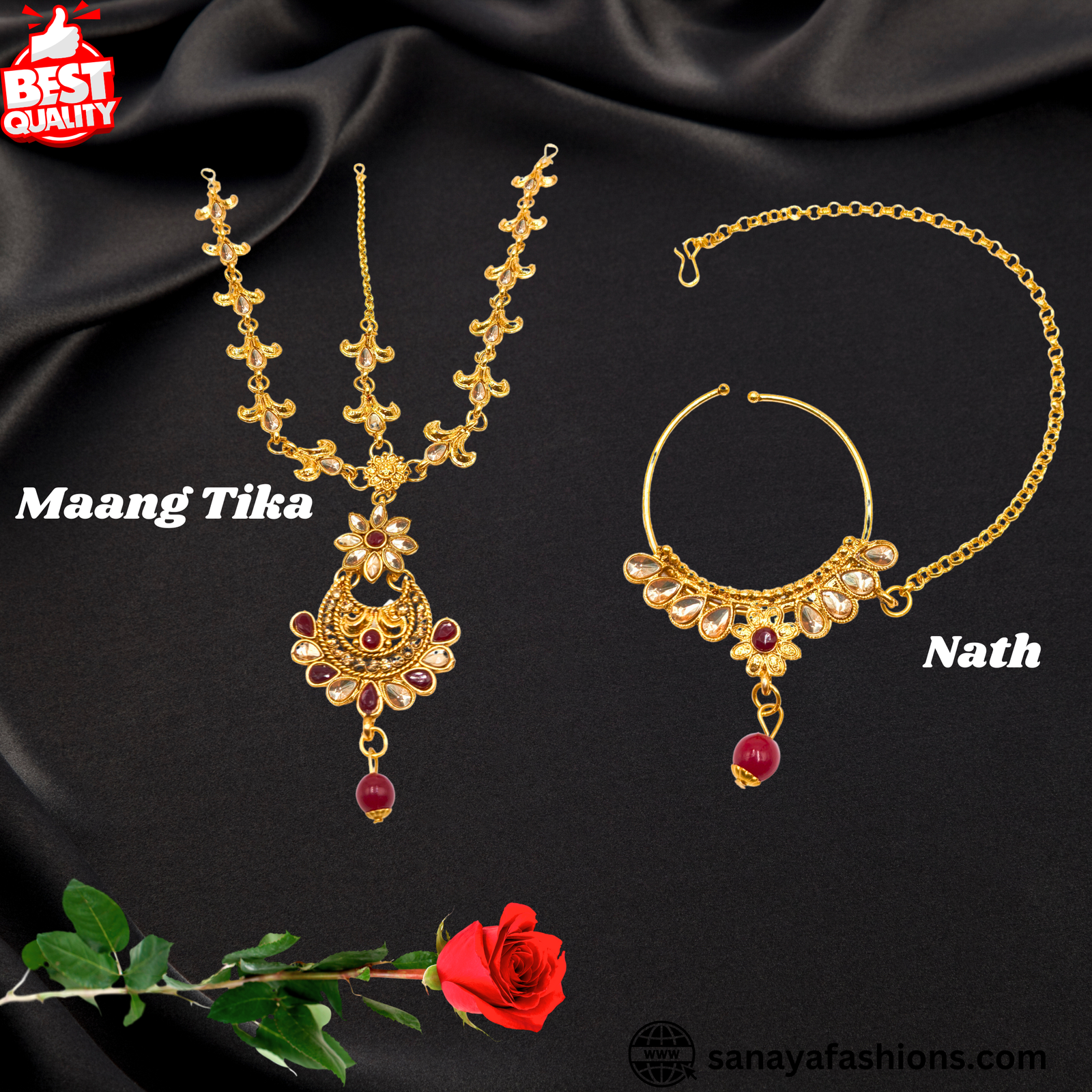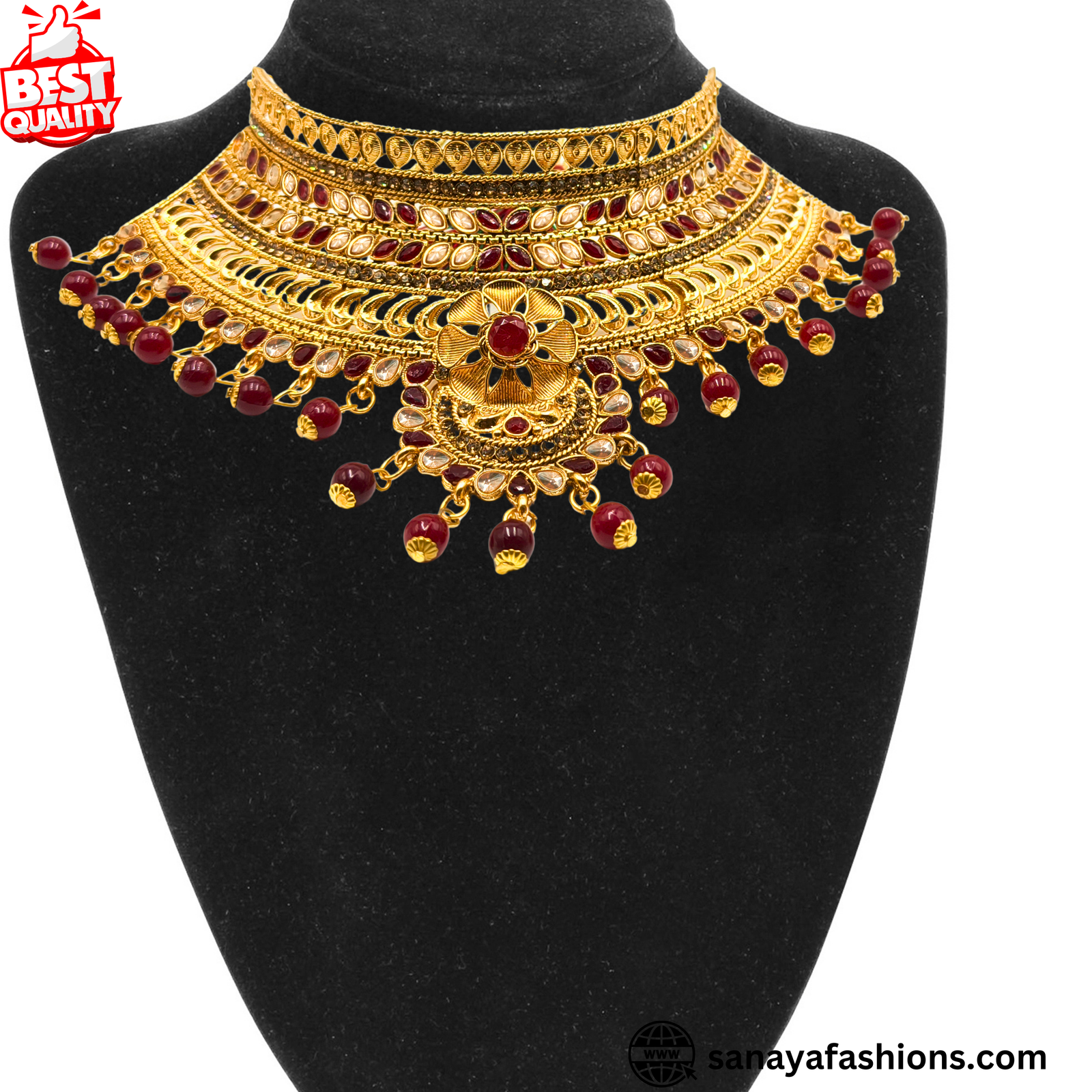Designed with intricate detailing in gold plating and elegant maroon stone embellishments, this jewellery set beautifully complements bridal attire, whether it’s a lehenga, saree, or gown. The lightweight yet durable finish ensures you stay comfortable throughout your wedding rituals and celebratio